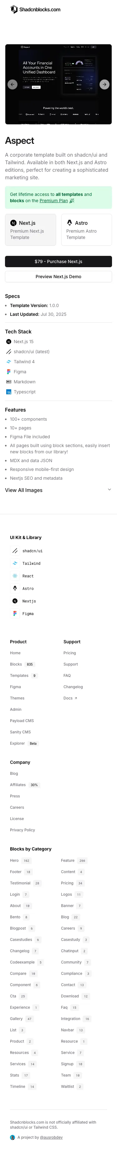 Aspect is a polished corporate marketing template built with Next.js 15, shadcn/ui, and Tailwind 4. It delivers a clean, engaging online presence with a robust block-based architecture, SEO-ready setup, and responsive, themeable UI—ideal for corporate sites and fast-growing brands.